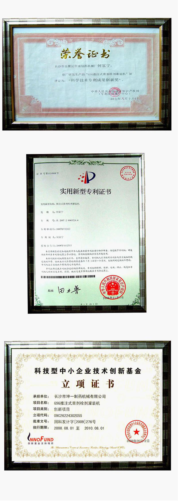 2009年,我廠董事長何家寧先生發明的“GSG型膏劑栓劑灌裝機”榮獲國家創新基金支持(注:長沙市坤一制藥機械有限公司是中南制藥機械廠下屬企業,專門研制開發高新技術項目。法定代表人:何家寧)。這款機器已在國內、國外使用五年,可以灌裝液體、膏劑、凝膠、栓劑等,可以是推注式(注射器)藥具或其他形狀藥具,只要口徑大于2.4mm即可灌裝,每次灌裝8瓶。由于采用了直線式灌裝,灌裝過程平穩,對位準確,劑量精密,每分鐘灌裝60-100瓶。