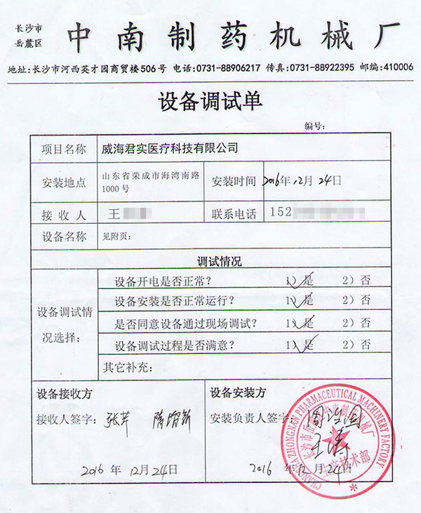 威海海洋職業學院經過全面考察對比,最終選擇了我廠生產的成套制藥設備生產線,包括:片劑設備、全自動膠囊填充機、顆粒粉劑設備、口服液制劑設備等27種制藥設備,2016年12月24日經過我廠專業技術人員上門安裝調試,全套設備生產線全面調試安裝驗收完成,客戶對我們的專業服務給予了高度評價。