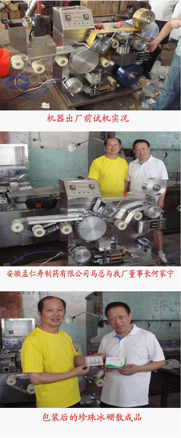 2010年7月,安徽孟仁壽制藥有限公司向我廠購買DPH-90異形物料大尺寸鋁塑包裝機,用于包裝珍珠冰硼散(塑料瓶裝,4支/版)