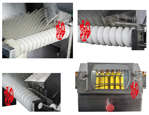 本機是玻璃瓶液體灌裝后的檢驗設備,待檢驗的瓶子排成一排經過檢驗口,瓶子后面有白色光透照,瓶子前面有放大鏡放大,玻璃瓶子里的異物很容易地被目測。