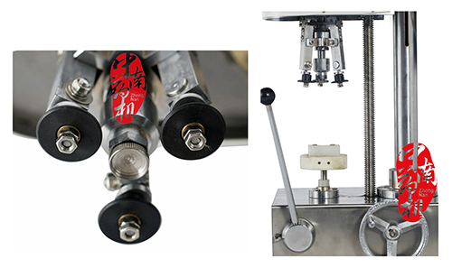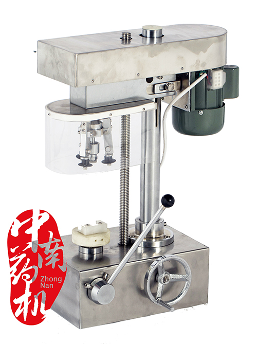 該機為臺式三刀旋風軋蓋機,臺面用不銹鋼板全包,整潔耐腐蝕易清掃,軋蓋刀頭系用優(yōu)質(zhì)鋼材加工,表面淬火處理,經(jīng)久耐用。工作時,被軋蓋瓶子不轉(zhuǎn),均布120°三只旋風刀旋轉(zhuǎn)軋蓋封口,刀柄設計為彈簧結(jié)構(gòu),三刀的距離可以微調(diào),適應性強,軋蓋成品率高,馬達罩也選用不銹鋼罩。本機是部隊、醫(yī)院、化驗室、小型制藥廠的選擇。