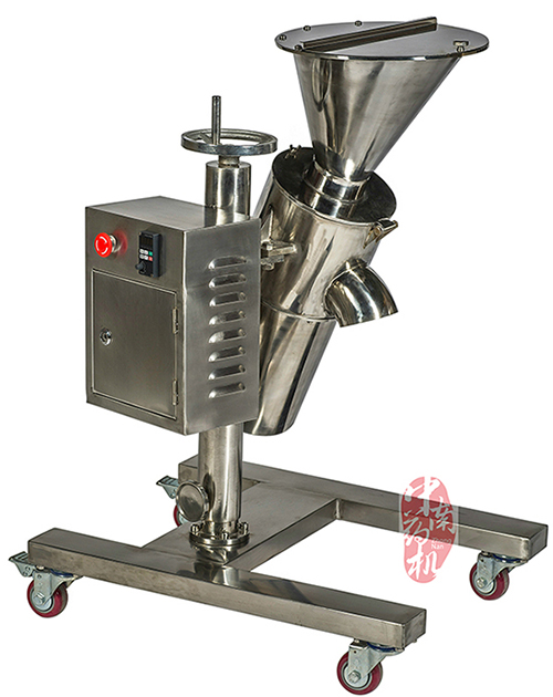 為什么要用快速整粒機整粒?因為物料經顆粒機制粒后,還需烘干,但烘干的顆粒會結成塊狀,因此需要再次整粒。有的藥廠為省錢,仍用顆粒機整粒,但整粒后多伴有粉末,且顆粒易破碎,顆粒質量不好。這是什么原因呢?這是由顆粒機整粒原理決定的: 顆粒機工作時,七角滾筒邊緣旋轉擠壓物料,使物料顆粒從篩孔中穿出,有一部分則因擠壓而變成粉末。