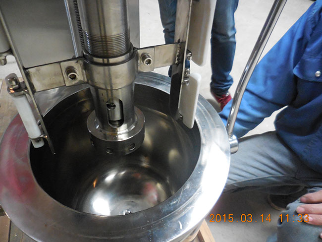 物料在水鍋、油鍋內通過加熱、攪拌進行混合反應后,由真空泵吸入乳化鍋,通過乳化鍋內攪拌,聚四氟乙烯刮板始終迎合攪拌鍋形體,刮凈掛壁粘料,使被括取的物料不斷產生新界面,再經過葉片與回轉葉片的剪斷、壓縮、折疊,向下流往鍋體下方的均質器,物料再次通過高速旋轉的切割輪與固定的切割套之間所產生的強力剪斷、沖擊、亂流后,迅速破碎成200nm-2um的微粒。由于乳化鍋內處于真空狀態,物料在攪拌過程中產生的氣泡被及時抽走。