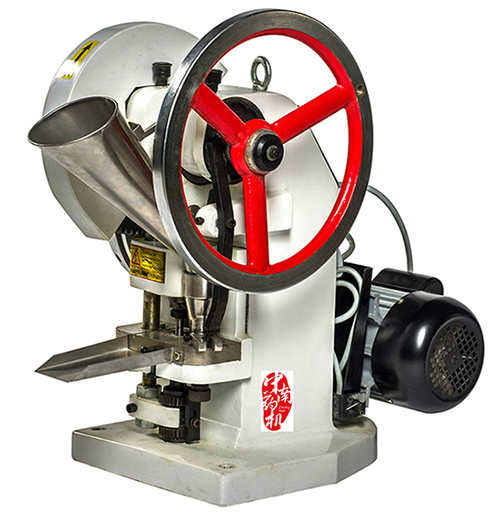 單沖壓片機用于將各種顆粒狀原料壓制成片劑,可廣泛用于制藥、化工、食品、醫院科研等單位試制成小批量生產各種片劑、糖片、鈣片、異形片等。其特點是一種小型臺式電動連續壓片的機器,也可以手搖。具有使用方便,易于維修,體積小、重量輕,機上安裝一副沖模,物料的充填深度,壓片的壓力、厚度均可調節。