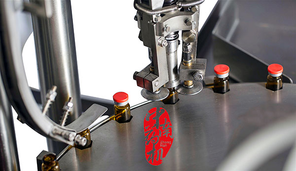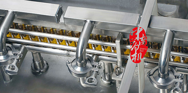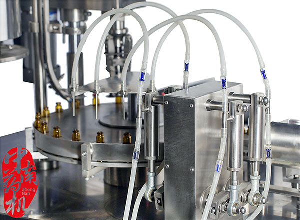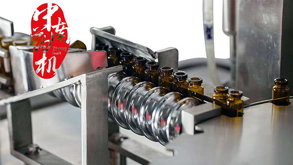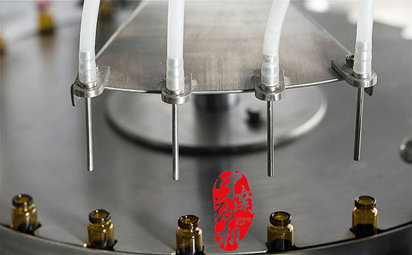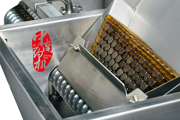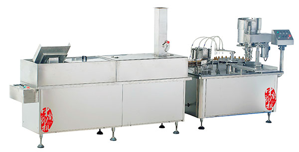 瓶子經自來水(或回用水)及去離子水內外沖洗,再由凈化壓縮空氣吹去表面的水珠,然后進入烘干段烘干。瓶子出烘箱,進入灌封機進行灌裝軋蓋。可與燈檢機,貼標機等設備連線。符合GMP要求。